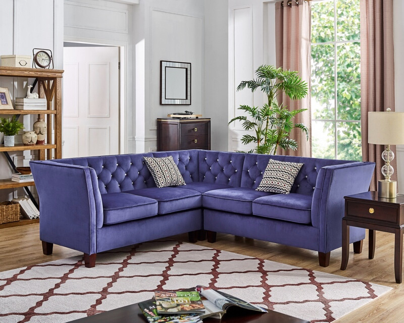 3 pc Trane blue velvet like fabric sectional sofa flared arms. This set includes the 3 pc sectional set , LAF love seat, Corner wedge, RAF love seat. Sectional as shown measures 89″ x 89″ x 33 x 33″ H. Ready to assemble. Requires assembly.