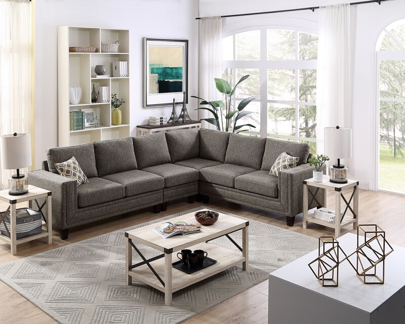4 pc Stephan brown cotton blended fabric sectional sofa squared arms. This set includes the 4 pc sectional set , LAF love seat, Corner wedge, armless chair, RAF love seat. Sectional as shown measures 115″ x 90″ x 33 x 36″ H. Armless chair can go on either side. Ready to assemble. Requires assembly.