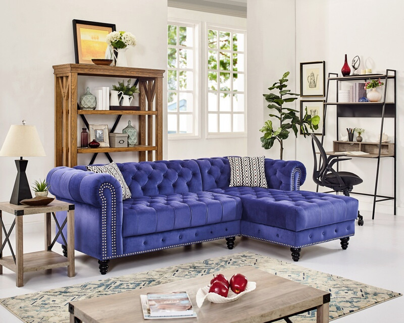 Source: OAH D6160 2 pc Uranda blue velvet like fabric sectional sofa tufted accents