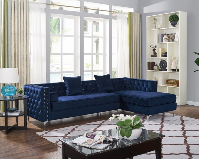 Source: OAH D6167 2 pc Veranda dark blue velvet like fabric sectional sofa tufted accents