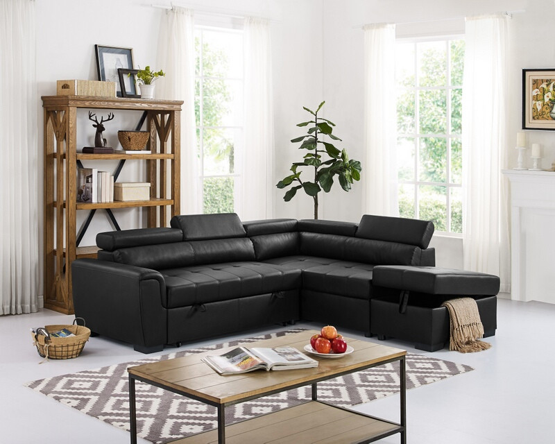 3 pc Madison black faux leather sectional sofa set with pull out sleep area. Sectional features a pull out bed area underneath love seat and flip up storage ottoman and flip up headrests. Sectional measures 95″ x 61″ L Chaise x 35″ D x 33″ H. Ottoman shown at end of chaise measures 22″ x 34″ x 18″ H. Some assembly may be required.