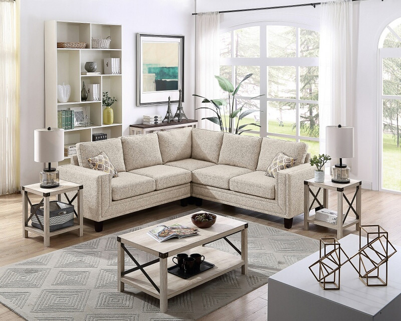 3 pc Stephan beige cotton blended fabric sectional sofa squared arms. This set includes the 3 pc sectional set , LAF love seat, Corner wedge, RAF love seat. Sectional as shown measures 90″ x 90″ x 33 x 36″ H. Ready to assemble. Requires assembly.
