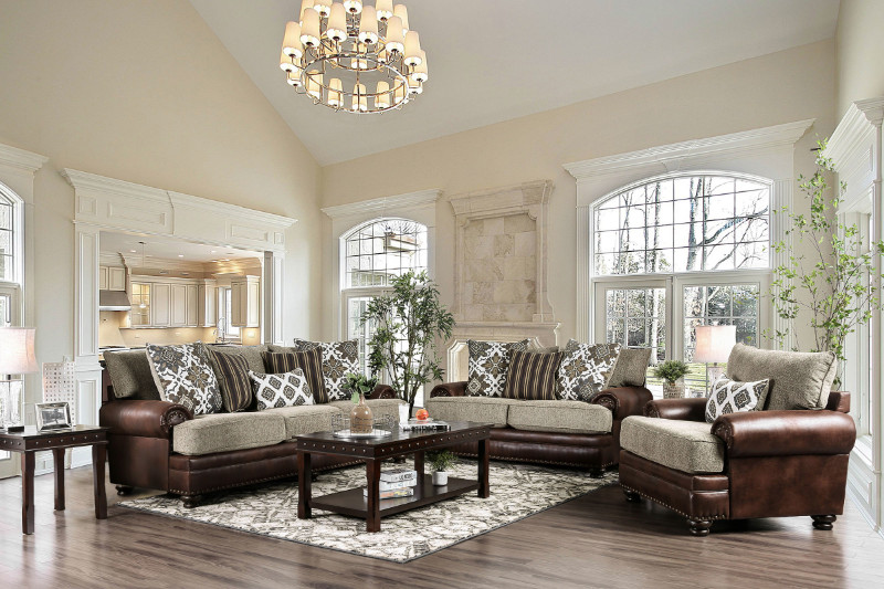 Source: SM5147 2 pc Reyna brown leather like fabric and chenille sofa and love seat set