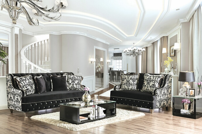 SM6305 2 pc nazzareno collection black premium fabric upholstered sofa and love seat set with crystal button tufts