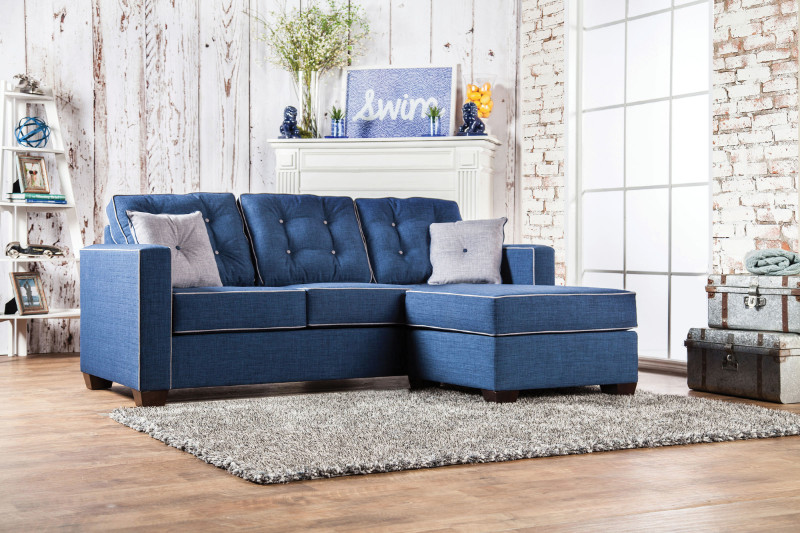 2 pc ravel II blue fabric sectional sofa set with square arms and accented piping trim. This set includes the 2 piece sectional with chaise. Sectional measures 84″ x 66″ L chaise x 36″ D x 39″ H. Some assembly required