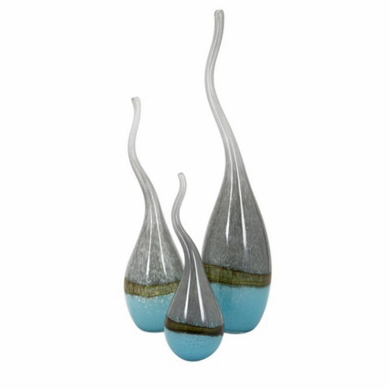Squiggle Glass Vases – Set Of 3. Artfully modern this trio of squiggle vases are handcrafted from fine artisan glass in shades of blue green and gray, set of 3.Attractive multi-color finish will be eye-catching display.. Measures 5″ x 5″ x 17″ . Some assembly required.