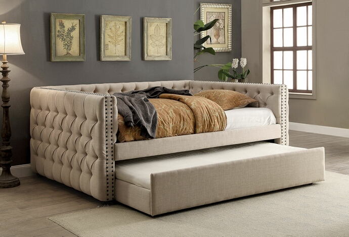 Suzanne collection ivory tufted linen like fabric upholstered twin size day bed. Twin size day bed measures 88 1/4″ x 43″ x 35 1/4″. Pull out trundle available separately at additional cost and measures 76 1/2″ x 41 1/2″ x 13 1/4″ H. Some assembly required.