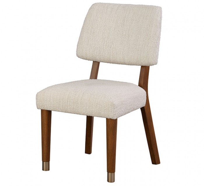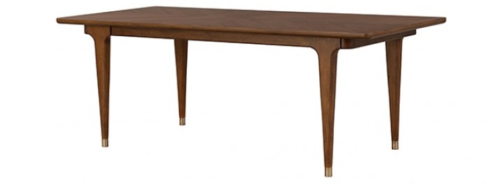 FM34000WN-T-7PC 7 pc Hepburne walnut finish wood mid-century modern dining table set gold capped legs. Set includes table with gold capped legs, chairs with upholstered backs and padded seat. Table measures 38″ x 82″ x 30″ H. Chairs measure 19″ x 22″ x 33″ H. Additional chairs also available separately. Some assembly required.