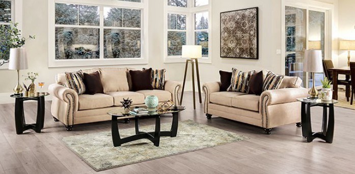 Source: FM65004BG 2 pc Yucatan beige fabric traditional sofa and love seat set dark cherry wood trim