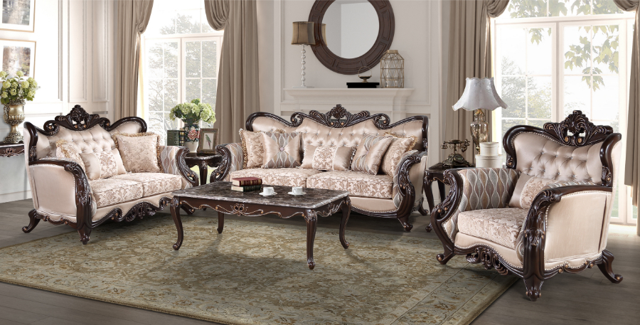U532T-2PC 2 pc Royal classics Constantine cherry finish wood traditional style sofa and love seat set carved accents 18th century. This set includes Sofa and Love seat. Sofa measures 94.5″ x 38.5″ x 48.5″ H. Love seat measures 69.5″ x 38.5″ x 48.5″ H. Chairs , coffee and end tables also available separately at additional cost. Some assembly required.